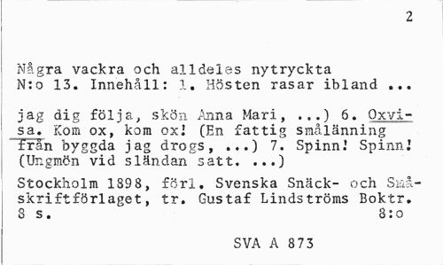 //// 2 //// Några vackra och alldeles nytryckta //// N:o 13. Innehåll: 1. Hösten rasar ibland ... //// jag dig följa, skön Anna Mari, ...) 6. Qxvi-sa. Kom ox, kom oxl (En fattig smålänning //// frän byggda jag drogs, ...) 7. Spinn.' Spinnl (Ungmön vid sländan satt. ...) //// Stockholm 1898, förl. Svenska Snäck- och Småskrift förlaget , tr. Gustaf Lindströms Boktr. //// 8 s. " 3:o //// SVA A 8 73 ////