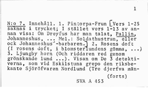 //// 1 //// N:o 7. Innehåll, 1. Pintorpa-Frun LVers 1-25 saknas i trycket; I stället vers 1-13 av annan visa: Om Dreyfus har man talat, Pallin, Johanneshus, ... Mel.: Soldathustrun,*" eller ock Johanneshus"-barbaren.1 2. Rosens doft (I rosens doft, i blomsterlundens gömma, .„.) 3. Ljungby horn (Och riddaren red genom grönskande lund ...). Visan om De 3 detektiverna, som vid Eskilstuna grepo den riksbekante Sjöröfvaren Nordlund (Tre djerfva män- //// (forts) //// SVA A 45 3 ////