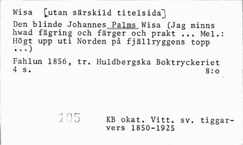 //// Wisa [utan särskild titelsidaj //// Den blinde Johannes Palms Wisa (Jag minns hwad fägring och färger och prakt ... Mel.: //// Högt upp uti Norden på fjällryggens topp »» ») //// Fahlun 1856, tr. Huldbergska Boktryckeriet 4 s. 8:0 //// .1 p— //// j J KB okat. Vitt. sv. tiggar-vers 1850-1925 ////