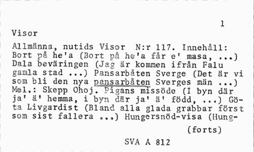 //// 1 //// Visor //// Allmänna, nutids Visor N:r 117. Innehåll: Bort på he'a (Bort på he'a får e' masa, ...) Dala beväringen (Jag är kommen ifrån Falu gamla stad ...) Pansarbåten Sverge (Det är vi som bli den nya pansarbåten Sverges män ...) Mel.: Skepp Ohoj. Pigans missöde (I byn där ja' ä' hemma, i byn där ja' ä' född, ...) Göta Livgardist (Bland alla glada grabbar först som sist fallera ».,) Hungersnöd-visa (Hung- //// (forts) //// SVA A 812 ////