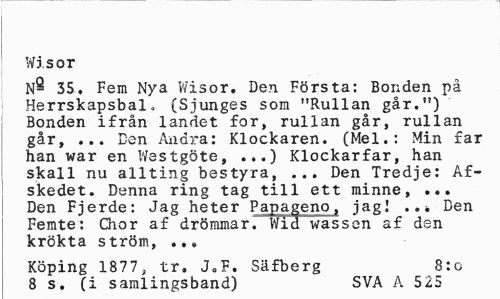//// Wisor //// N- 35, Fem Nya Wisor. Den Första: Bonden på Herrskapsbal» (Sjunges som "Rullan går.") Bonden ifrån landet for, rullan går, rullan går, ... Ben Andra: Klockaren. (Mel.: Min far han war en Westgöte, ...) Klockarfar, han skall nu allting bestyra, ... Den Tredje: Af-skedet. Denna ring tag till ett minne, ... Den Fjerde: Jag heter Papageno, jagl ..»Den Femte: Chor af drömmar. Wid wassen af den krökta ström, ... //// Köping 1877, tr. J„F. Säfberg 8:0 //// 8 s. (i samlingsband) SVA A 5 25 ////