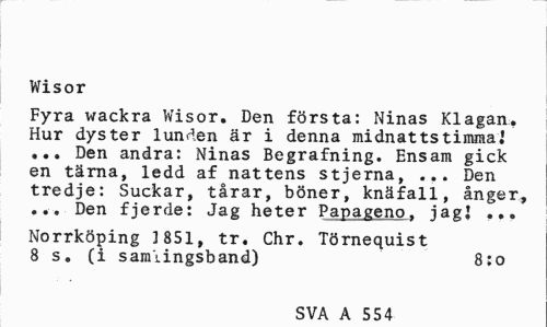 //// Wisor //// Fyra wackra Wisor, Den första: Ninas Klagan. Hur dyster lunden är i denna midnattstimma] ... Den andra: Ninas Begrafning. Ensam gick en tärna, ledd af nattens stjerna, ... Den tredje: Suckar, tårar, böner, knäfall, ånger, ... Den fjerde: Jag heter Papagenof jagl ... //// Norrköping 1851, tr. Chr. Törnequist 8 s. (i samiingsband) 8:0 //// SVA A 554 ////