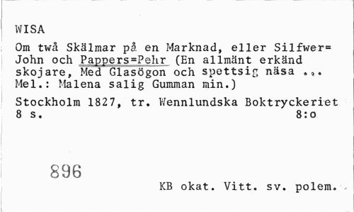 //// WISA //// Om twå Skälmar på en Marknad, eller Silfwer= John och Pappers=Pehr (En allmänt erkänd skojare, Med Glasögon och spettsig näsa »,. Mel.: Malena salig Gumman min.) //// Stockholm 182 7, tr. Wennlundska Boktryckeriet 8 s. 8:0 //// 896 //// KB okat. Vitt. sv. polem. > ////