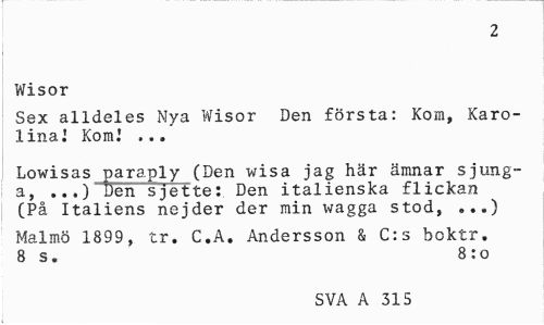 //// 2 //// Wisor //// Sex alldeles Nya Wisor Den första: Kora, Karolina.' Kora.' ... //// Lowisas paraply (Den wisa jag här ämnar sjung-a, ...) Den sjette: Den italienska flickan (På Italiens nejder der min wagga stod, ...) //// Malmö 1899, tr. C.A. Andersson & C:s hoktr. 8 s. 8 :o //// SVA A 315 ////