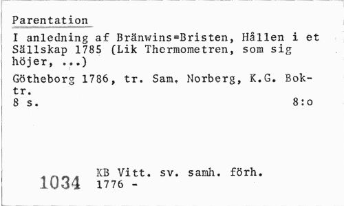 //// Parentation //// I anledning af Bränwins=Bristen, Hållen i et Sällskap 1785 (Lik Thermometren, som sig höjer» ...) //// Götheborg 1786, tr. Sam. Norberg, K.G. Bok-tr. //// 8 s. 8:o //// KB Vitt. sv. samh. förh. //// 10 3 4 1776 - ////