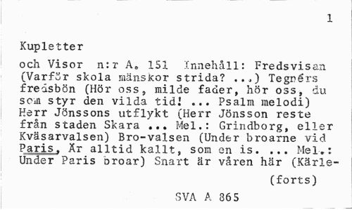 //// 1 //// Kupletter //// och Visor n:r A„ 151 Innehåll: Fredsvisan (Varför skola mänskor strida? ..*) Tegnérs fredsbön (Hör oss, milde fader, hör oss, du som styr den vilda tidl ... Psalm melodi) Herr Jönssons utflykt (Herr Jönsson reste från staden Skara ... Mel.: Grindborg, eller Kväsarvalsen) Bro-valsen (Under broarne vid Paris. Är alltid kallt, som en is. ... Mel.: Under Paris broar) Snart är våren här (Kärle- //// (forts) //// SVA A 36 5 ////