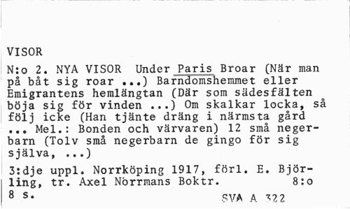 //// VISOR //// N:o 2. NYA VISOR Under Paris Broar (När man på båt sig roar ...) Barndomshemmet eller Emigrantens hemlängtan (Där som sädesfälten böja sig för vinden ...) Om skalkar locka, så följ icke (Han tjänte dräng i närmsta gård ... Mel.: Bonden och värvaren) 12 små negerbarn (Tolv små negerbarn de gingo för sig själva, ...) //// 3:dje uppl. Norrköping 1917, förl. E. Björ-ling, tr. Axel Norrmans Boktr. 8:o //// 8 s* SVA A ^22 ////