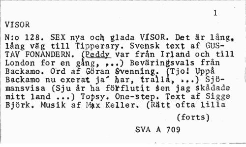 //// 1 //// VISOR //// N:o 128. SEX nya och glada ViSOR. Det är lång, lång väg till Tioperary. Svensk text af GUSTAV FONANDERN. (Peddv var från Irland och till London for en gång, Beväringsvals från //// Backarao. Ord af Göran Svenning. (Tjo i Uppå Backamo nu exerat ja" har, tralla, bP.) Sjömansvisa (Sju år ha förflutit åen jag Skådade mitt land ...) Topsy. One-step» Text af Sigge Björk. Musik af M*x Keller. (Rätt ofta lilla //// (forts) //// SVA A 712 ////