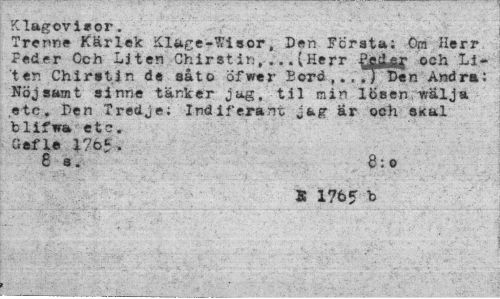 //// Klagovisor. //// Trerme Kärlek Klace-Msor, Den Första; Om Herr Feder Och Li ten OhirStirj,... (Herr och Li- //// ten Chirstin de såto öfwer Eord,.,rT^en Andra: Nöjsamt sinne tänker jag, til min lösen v?älja «tc. Den Tredje: Indiferant jag- ar och sKal blifwa etc. Gefle 1?65 . //// 8 s. 6:o //// K 1765 b //// jr ////