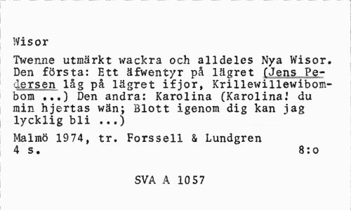 //// Wisor //// Twenne utmärkt wackra och alldeles Nya Wisor. Den första: Ett äfwentyr på lägret fJens Peder sen låg på lägret ifjor, Krillewillewibom-bom ...) Den andra: Karolina (Karolina.1 du min hjertas wän; Blott igenom dig kan jag lycklig bli ...) //// Malmö 1974, tr. Forssell & Lundgren 4 s. 8:0 //// SVA A 10 57 ////