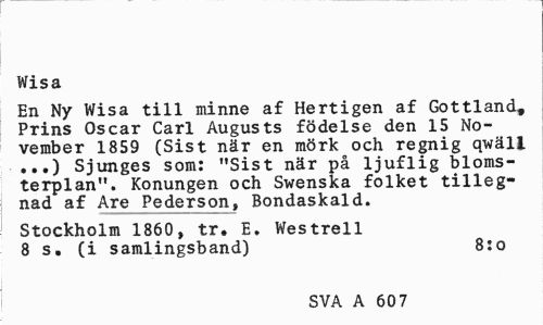//// Wisa //// En Ny Wisa till minne af Hertigen af Gottland, Prins Oscar Carl Augusts födelse den 15 November 1859 (Sist när en mörk och regnig qwäll ...) Sjunges som: "Sist när på ljuflig blomsterplan". Konungen och Swenska folket tilleg-nad af Are Pederson, Bondaskald. //// Stockholm 1860, tr. E. Westrell 8 s. (i samlingsband) 8:o //// SVA A 60 7 ////