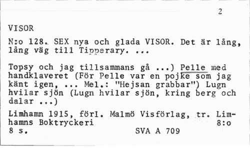 //// 2 //// VISOR //// N:o 128.. SEX nya och glada VISOR. Det är lång, lång väg till Tipperary. ... //// Topsy och jag tillsammans gå ...) Pelle med handklaveret (För Pelle var en pojke som jag känt igen, ... Mel.: "Hejsan grabbar") Lugn hvilar sjön (Lugn hvilar sjön, kring berg och dalar ...) //// Limhamn 1915, förl. Malmö Visförlag, tr. Limhamns Boktryckeri 8:o 8 s. SVA A 709 ////