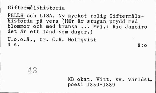 //// Giftermålshistoria //// PELLE och LISA. Ny mycket rolig Giftermåls-historia på vers (Här är stugan prydd med blommor och med kransa ... Mel.: Rio Janeiro det är ett land som duger.) //// U.o.o.å., tr. C.R. Holmqvist 4 s. 8:0 //// 48 //// KB okat. Vitt. sv. världsL. poesi 1850-1889 ////