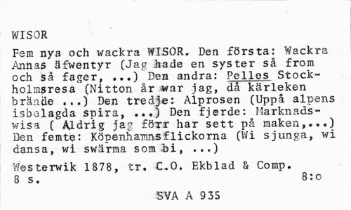 //// WISOR //// Fem nya och wackra WISOR. Den första: Wackra Annas äfwentyr (Jag hade en syster så from och så fager, ...) Den andra: Pelles Stock-holmsresä (Nitton år war jag, då kärleken brände ...) Den tredje: Alprosen (Uppå alpens isbelagda spira, ...) Den fjerde: Marknads-wisa ( Aldrig jag föTr har sett på maken,...) Den femte: Köpenhamnsflickorna (Wi sjunga, wi dansa, wi swärma som bi, ...) //// Westerwik 1878 , tr. C.0. Ekblad & Comp. 8 s. 8:o //// SVA A 35 ////
