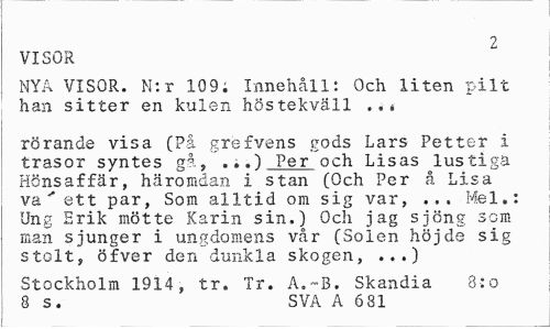 //// 2 //// VISOR //// NYA VISOR. N:r 10 9; Innehåll: Och liten pilt han sitter en kulen höstekväll ..é //// rörande visa (På grefvens gods Lars Petter i trasor syntes gå, ...) Per och Lisas lustiga Hönsaffär, häromdan i stan (Och Per å Lisa va "ett par, Som alltid om sig var, ... Mel,: Ung Erik mötte Karin sin.) Och jag sjöng som man sjunger i ungdomens vår (Solen höjde sig stolt, öfver den dunkla skogen, ...) //// Stockholm 1914, tr. Tr. A.-B. Skandia 3:o 8 s. SVA A 6 81 ////