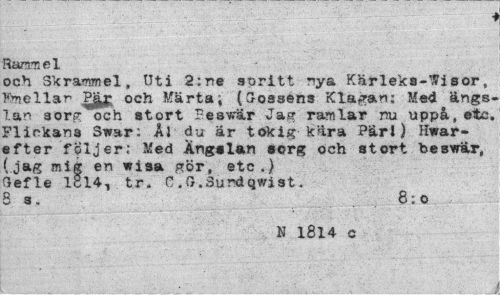 //// • - - - — "S4 -—...- ... ^ //// Raramel //// och Skrammel, Uti 2:ne soritt nya Kärleks-^isor, Kmellan och Märta, (Sossens Klagan; Med ängs- //// lan sorsr och stort Besvrär Jag ramlar nu uppå, etc. Flickans Swar: Ål du är tokig k'4ra Pärl) Hwar-efter följer: Med Äng«l«n sorg och stort beswär, (jag mig en wisa gör, etc.) flefle 1814, tr. C.Ö.Sundqwist. B s. . 8:0 //// K 1814 c ////