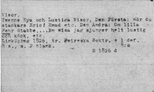 //// Visor. //// Twenne Nya och Lustiga WIser> Pen Första; ^ör du stackars Eric/ Hwad etc. Cen Andra: Ga lilla Pehr Staebe,.. ,j:n wisa jag- sjunger helt lustig ocTl käck, etc. //// Linköp in 1826, tr. Betreska. B-oktr. * 1 def. 8 s., s. 2 Mark. B: o //// E 1826 d ////