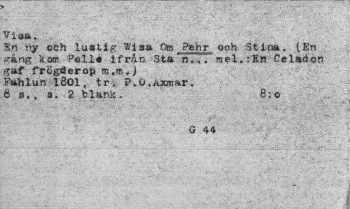 //// Viaa. //// Sn ny och lustig Wisa Om Pehr och Stina. (En //// gång kojt Pelle ifrån Sta'h... mel.:X» Celadon //// gaf frögderop a,m.) //// Fahlun 1Ö01, tr. P.Q.Åxmar. //// 8 s., s. 2 blank. 8:o //// G 44 ////