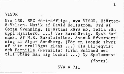 //// 1 //// VISOR //// N:o 130. SEX förträffliga, nya VISOR. Hjärter-ö-Valsen. Musik af David Hellström. Ord af Göran Svenning. (Hiärtans kära mö, lella vän uppå Hjärterö. ...) Var Barmhärtig. Rysk Romans. Af N.R. Bakaleinikow. Svensk öfversätt-ning af Algot Sandberg. (För en leende skymt af ditt trollögas glans ...) Ola Liljeqvist och Pernilla (Pernilla: Ifrån Småland ner till Skåne man mig lockat ...) Ny Spelemans- //// (forts) //// SVA A 711 ////