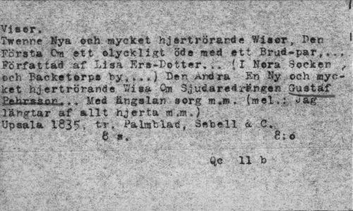 //// Viaor. //// Twenne Kya och mycket hjertrörande Wiaer, Pen Första On ett olyckligt öde med ett Brud-par,.,. Författad af Li»a Era-Dotter.;. (I Nora Sorken och Packetorps by,...} Den Andra En % 0Ch mycket hj ertrörande 1!iaa Om Sjudaredrännen Ouatäf gfthr.a* otu *. Med ängalan sorg m.». (mel • aff''""** längtar af allt hjerta m .m .) Upsala 1835, tr. Palmblad, Snbéti & C. //// 8 ». 8;o //// qc 11 b ////
