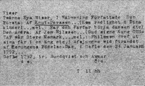 //// Vi«.r //// Twänne Nya Wittr. I ening Författade Den //// Fört t»; Af Knut »ger ston .. ,|Kw redlighet i Pina kläéerieivr F«r"~oé1i Farfar börja da»t'«» etc) Den Andra, Af Jen Nilsson. ., (State «i<i$t J^f //// «ir Stere Menark,.,»««!.; P^flewtn N ut " sina far t. en äng etc*) Afsjumne wid. firandét'. af Ronurigeöt Födelse-Bas, i Cefle den 24-< J-anoftrtt 1792,... .'JÉ //// 0£fl>e 17^2, tr, Surrfqvist och An ar- - J //// T 11 hh ////