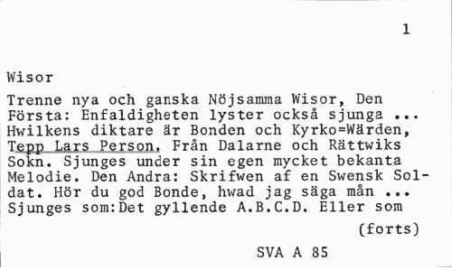 //// 1 //// Wisor //// Trenne nya och ganska Nöjsamma Wisor, Den Första: Enfaldigheten lyster också sjunga ... Hwilkens diktare är Bonden och Kyrko=Wärden, Tepp Lars Person. Från Dalarne och Rättwiks Sokn. Sjunges under sin egen mycket bekanta Melodie. Den Andra: Skrifwen af en Swensk Soldat. Hör du god Bonde, hwad jag säga mån ... Sjunges som:Det gyllende A.B.C.D. Eller som //// (forts) //// SVA A 7H85 ////