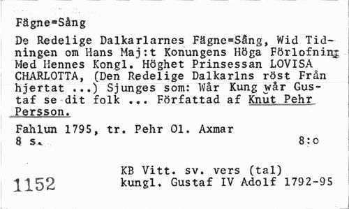 //// Fägne«Sång //// De Redelige Dalkarlarnes Fägne=Sång, Wid Tidningen om Hans Haj:t Konungens Höga Förlofninj Med Hennes Kongl. Höghet Prinsessan LOVISA CHARLOTTA, (Den Redelige Dalkarins röst Från hjertat ...) Sjunges som: Wår Kung wår Gustaf se dit folk ... Författad af Knut Pehr Persson. //// Fahlun 1795, tr. Pehr 01. Axmar 8 s^ 8:o //// KB Vitt. sv. vers (tal) 1152 kungl. Gustaf IV Adolf 1792-95 ////