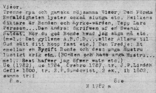 //// Visor» //// T-renne rya och gar!ska nöj samaa Wl«»ry Första Enfaldigheten lyster också siuhga etc. Hwilkehs diktare är Bonden och Kyrko-warden, Tepp Lare Persson.«..Don Andra: Skrifwen af en Swenak .^oliatr, Hör du god Bonde hwad jftg säga må ete. (r«»l.: Det gyllene ä.P.C ,d. .. .eller Allena til Gud sätt ditt hopp fast etc.) Den Tredje: Et emellan en Nygift Bonde och dess unga Hustru lustigt krig etc., (BOnäen onh hans unga Hustru. mel.: Rest hafwer jag öfwer watn etc.) Uo [l?S2), uo 1784, trebro 1787, tr. J.P.LirSdh Cefle 1800, tr. F. t'. Sund ovist, a ex., it 1802. samma tr: i //// c» ' r> //// i n. o: o //// 3 1782 a ////