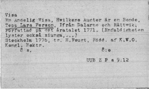 //// Visa //// tfn Anrielig Wisa, Hwilkens Auctor är en Bonde, Tepg^Lars ^Person, Ifrån Dalarne och Rättwik* //// P6r1"attaci"...pS""^? åratalet 1771. (Enfald isrheten //// lyster också siunsra,.,.) //// Stockholm 1776, tr.. H.Pouct, Ridd. af KJ.O. Konpl. Boktr. //// C s. 8¦o //// UUB Z P s 9.12 ////