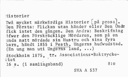 //// Historier //// TVå mycket märkwärdiga Historier [_på prosal. Den Första: Flickan utan händer eller Den Onde fick intet den gången. Den Andra: Beskrifning ofwer den Förskräcklige Mördaren, som på en anda natt mördade sin Hustru och sina fyra barn, händt 1855 i Pesth, Ungerns hufwudstad. (En ung man uti Ungerns land, ...) //// Stockholm 1875 , tr0 Associati.ons=Boktrycke-riet //// 16 s. (i samlingsband) 8:o //// SVA A 537 ////