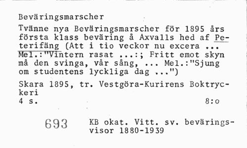 //// Beväringsmarscher //// Tvänne nya Beväringsmarscher för 1895 års första klass beväring å Axvalls hed af Pe-terifäng (Att i tio veckor nu excera ... MeTT": "Vintern rasat ...:; Fritt emot skyn må den svinga, vår sång, ... Mel.:"Sjung om studentens lyckliga dag ...") //// Skara 1895, tr. Vestgöra-Kurirens Boktryckeri //// 4 s . 8: o //// CQQ KB okat. Vitt. sv. bevärings- //// visor 1880-1939 ////