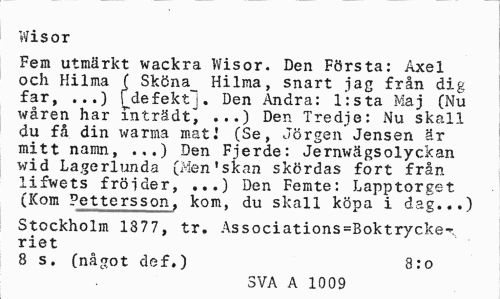 //// Wisor //// Fem utmärkt wackra Wisor. Den Första: Axel och Hilma £ Sköna Hilma, snart jag från dig far, ...) [defekt]. Den Andra: l:sta Maj (Nu wåren har Tnträdt^ ...) Den Tredje: Nu skall du få din warma mat.' (Se, Jörgen Jensen är mitt namn, ...) Den Fjerde: Jernwägsolyckan wid Lagerlunda (Men'skan skördas fort från lifwets fröjder, ...) Den Femte: Lapptorget (Kom Pettersson, kom, du skall köpa i dag...) //// Stockholm 1377, tr. Associations=Boktrycke->-, riet //// 8 s. (något def.) 8:0 //// SVA A 1009 ////