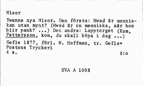 //// Wisor //// Twenne nya Wisor. Den första: Hwad är mennis-kan utan mynt? (Hwad är en menniska, när hon blir pank? ...) Den andra: Lapptorget (Kom, Pettersson, kom, du skall köpa i dag ...) //// Gefle 1877, förl. W. Hoffman, tr. Gefle» Postens Tryckeri //// 4 s. 8:0 //// SVA A 1008 ////