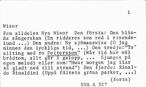 //// 1 //// Wisor //// Fem alldeles Nya Wisor Den första: Den blinda sångerskan (En riddares son red i rosende-lund ...) Den andra: Ny sjömanswisa (0 jag minnes den lyckliga tid, ...) Den tredje:"Ta" allting med ro Pettersson" (Wår tid har wäl brådtom, allt går i galopp, ... Sjunges på egen melodi eller som:"Hwar morgon jag ilar så gladt ned till strand") Den fjerde: Rinal-do Rinaldini (Uppå fältets gröna parker, ...) //// (forts) //// QVA A ////