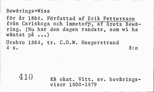 //// Bewärings=Wisa //// för år 1864. Författad af Erik Pettersson från Carlskoga och Immetorp, af årets Bewä-ring. (Nu har den dagen randats, som wi ha wäntat på ...) //// Örebro 1864, tr. C.O.W. Haegerstrand 4 s. 8: o //// 410 KB okat. Vitt. sv. bevärings- //// visor 1800-1879 ////