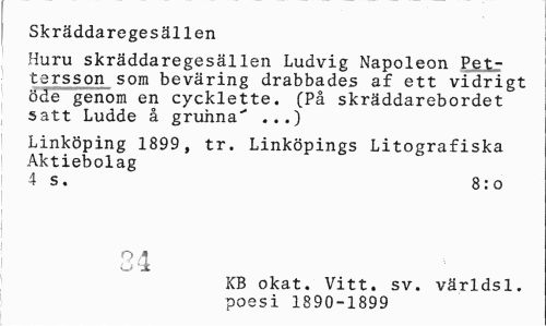 //// Skräddaregesällen //// Huru skräddaregesällen Ludvig Napoleon Pettersson som beväring drabbades af ett vidrigt öde genom en cycklette. (På skräddarebordet satt Ludde å gruhna^ ...) //// Linköping 1899, tr. Linköpings Litografiska Aktiebolag //// 4 s. 8:0 //// u •± //// KB okat. Vitt. sv. världsl. poesi 1890-1899 ////