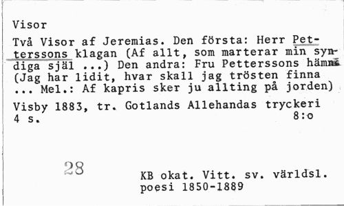 //// Visor //// Två Visor af Jeremias. Den första: Herr Petterssons klagan (Af allt, som marterar min syndiga själ ...) Den andra: Fru Petterssons hämim (Jag har lidit, hvar skall jag trösten finna ... Mel.: Af kapris sker ju allting på jorden) //// Visby 1883, tr. Gotlands Allehandas tryckeri 4 s. 8:o //// O Q //// ° KB okat. Vitt. sv. världs!. //// poesi 1850-1889 ////