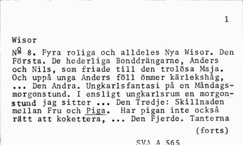 //// 1 //// Wisor //// N- 8. Fyra roliga och alldeles Nya Wisor. Den Första. De hederliga Bonddrängarne, Anders och Nils, som friade till den trolösa Maja. Och uppå unga Anders föll ömmer kärlekshåg, ... Den Andra. Ungkarls fantasi på en Måndagsmorgonstund. I ensligt ungkarlsrum en morgonstund jag sitter ... Den Tredje: Skillnaden mellan Fru och Piga. Har pigan inte också rätt att kokettera, ... Den Fjerde. Tanterna //// (forts) //// c\r a a c a. c ////