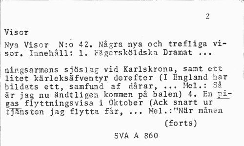 //// 2 //// Visor //// Nya Visor N:o 4 2. Några nya och trefliga visor. Innehåll: 1. Fägersköldska Dramat ... //// ningsarmens sjöslag vid Karlskrona, samt ett litet kärleksäfventyr derefter (I England har bildats ett, samfund af dårar, ... Mel.: Så är jag nu ändtligen kommen på balen) 4. En vigas flyttningsvisa i Oktober (Ack snart ur tjänsten jag flytta får, ... Mel.:"När månen //// (forts) //// SVA A 860 ////