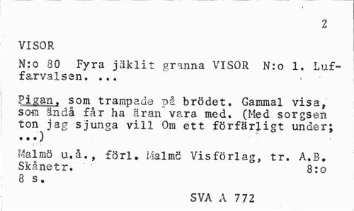 //// 2 //// VISOR //// N:o 80 Fyra jäklit granna VISOR N:o 1. Luf-f&rvalsen. ... ¦• //// Pigan, som trampade på brödet. Gammal visa, som ändå får ha äran vara med. (Med sorgsen //// ton jag sjunga vill Om ett förfärligt under; • •») //// Malmö u,å. , förl. Malmö Visförlag, tr. A.B. Skånetr. 8:o //// 8 s. //// SVA A 7 72 ////