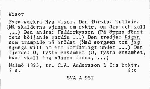 //// Wisor //// Fyra wackra Nya Wisor. Den första: Tullwisa (Må skalderna sjunga om rykte, om ära och gull »,.) Den andra: Fadderkyssen (På öppna fönstrets böljande gardin ...) Den tredje: Pigan som trampade på brödet (Med sorgsen ton jag sjunga will om ett förfärligt under ...) Den fjerde: 0, tysta ensamhet (0, tysta ensamhet, hwar skall jag wännen finna; ...) //// Malmö 1895 , tr. C.A. Andersson & C:s boktr. 8 s. 8:o //// SVA A 952 ////