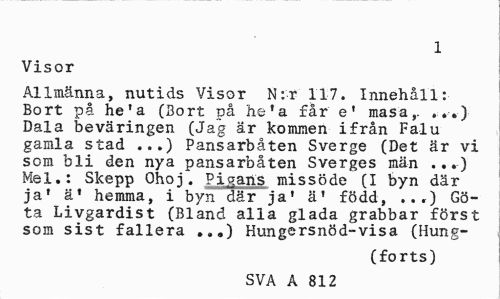 //// 1 //// Visor //// Allmänna, nutids Visor N:r 117. Innehåll: Bort på he'a (Bort på he'a får e' masa,. ...) Dala beväringen (Jag är kommen ifrån Falu gamla stad ...) Pansarbåten Sverge (Det är vi som bli den nya pansarbåten Sverges män ...) Mel.: Skepp Ohoj. Pigans missöde (I byn där ja' ä' hemma, i byn där ja' ä' född, ...) Göta Livgardist (Bland alla glada grabbar först som sist fallera ...) Hungersnöd-visa (Hung- //// (forts) //// SVA A 812 ////