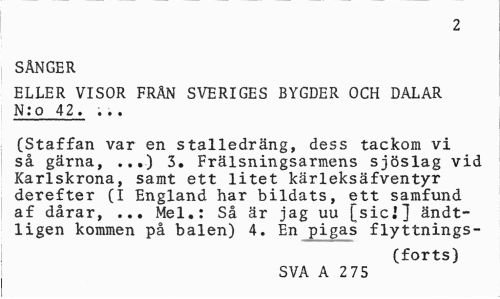 //// 2 //// SÅNGER //// ELLER VISOR FRÄN SVERIGES BYGDER OCH DALAR N:o 42. ... //// (Staffan var en stalledräng, dess tackom vi så gärna, ...) 3. Frälsningsarmens sjöslag vid Karlskrona, samt ett litet kärleksäfventyr derefter (I England har bildats, ett samfund af dårar, ... Mel.: Så är jag uu [sicj] ändt-ligen kommen på balen) 4. En pigas flyttnings- //// (forts) //// SVA A 2 75 ////