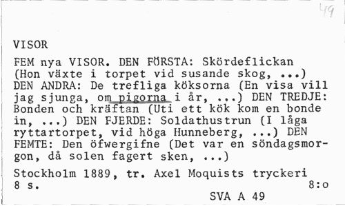 //// VISOR //// FEM nya VISOR. DEN FÖRSTA: Skördeflickan (Hon växte i torpet vid susande skog, ...) DEN ANDRA: De trefliga köksorna (En visa vill jag sjunga, om pigprna i år, .,.) DEN TREDJE: Bonden och kräftan (Uti ett kök kom en bonde in, ...) DEN FJERDE: Soldathustrun (I låga ryttartorpet, vid höga Hunneberg, ...) DEN FEMTE: Den öfwergifne (Det var en söndagsmorgon, då solen fagert sken, ...) //// Stockholm 1889, tr. Axel Moquists tryckeri 8 s. 8:0 //// SVA A 49 ////