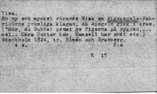 //// Vi»*. //// En ny och myckst rörande Wisa om Pigs^e^eIs-Fab-rikorns ynkeliga klagan, då dpeger^fi^rkra». ("Hör, du Gubbe 1 promt ge Pigorna på ryggart,... mel.; Kära Poktor kom, Mamsell har ond t etc.) Stockholm 1824, tr. Slmén och Qranberg. 4 s* e-.o //// ," ¦ • r;~ i: K 17 : V ////