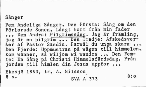 //// Sånger //// Fem Andeliga Sånger. Den Första: Sång om den Förlorade Sonen. Långt bort från min fader ... Den Andra: Pilgrimssång. Jag är främling, jag är en pilgrim ... Den Tredje: Afskedsverser af Pastor Sandin. Farwäl du unga skara ... Den Fjerde: Uppmuntran på wägen till himmelen. Kom wänner, så wiljom wi wandra ../. Den Femte: En Sång på Christi Himmelsfärdsdag. Från jorden till himlen din Jesus uppfor ... //// Ekesjö 1853, tr. A. Nilsson //// 8 s- SVA A 373 8:0 ////