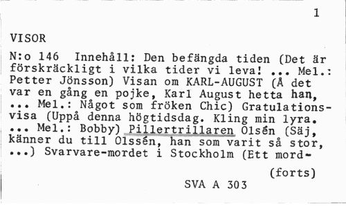 //// 1 //// VISOR //// N:o 146 Innehåll: Den befängda tiden (Det är förskräckligt i vilka tider vi leva! ... Mel.: Petter Jönsson) Visan om KARL-AUGUST (Å det var en gång en pojke, Karl August hetta han, ... Mel.: Något som fröken Chic) Gratulationsvisa (Uppå denna högtidsdag. Kling min lyra. ... Mel.: Bobby) Pillertrillaren Olsén (Säj, känner du till Olssén, han som varit så stor, ...) Svarvare-mordet i Stockholm (Ett mord- //// (forts) //// SVA A 30 3 ////