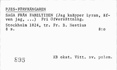 //// PJES-FÖRVRÄNGAREN //// SAGA FRÅN FABELTIDEN (Jag knäpper Lyran, äf-ven jag, ...) Fri öfversättning. //// Stockholm 1824, tr. Fr. B. Nestius 8 s. 8:0 //// or»- KB okat. Vitt. sv. polem, //// O Jd ////