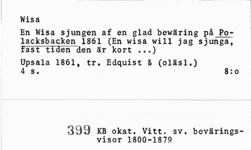 //// Wisa //// En Wisa sjungen af en glad bewäring på Polacksbacken 1861 (En wisa will jag sjunga, fast tiden den är kort .,.) //// Upsala 1861, tr. Edquist & (oläsl.) 4 s. 8:o //// 390 KB okat. Vitte sv, bevärings- //// visor 1800-1879 ////