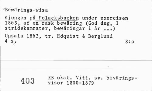 //// s'Bewä rings-wisa //// sjungen på Polacksbacken under exercisen 1863, af en rask bewäring (God dag, I stridskamrater, bewäringar i år ,,«,) //// Upsala 1863, tr. Edquist & Berglund 4 s. 8 ro //// • ro KB okat, Vitt, sv. bevärings- //// £Uo visor 1800-1879 ////